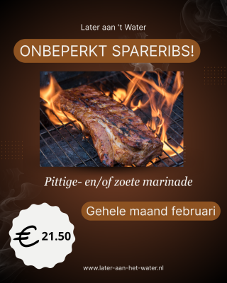 De gehele maand februari kunt u genieten van onbeperkt spareribs! Geserveerd met salade en cocktail- en knoflooksaus.